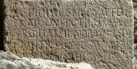 - griechisch: ἐποίησεν Κούαρτος / καὶ Κούειντος Μάρκῳ / τῷ πατρὶ καὶ Ὀβουλκίᾳ τῇ / μητρὶ ζώσῃ καὶ ἑαυτοῖς / μνήμης χάριν