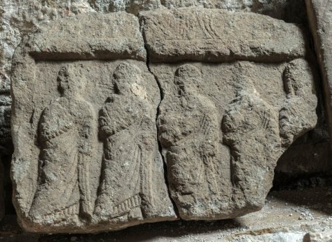 - Bildfeld mit fünf stehenden Personen. Oben Giebelansatz mit Ornament (?).