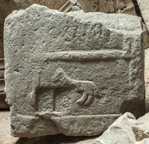 - Unten rechteckiges Feld mit vierfüßigem Tier. darüber Inschriftreste.