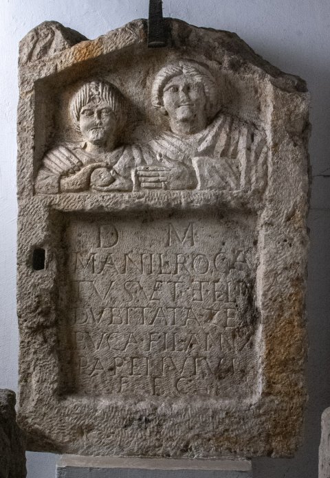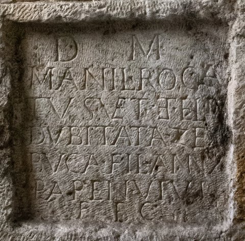 - D(is) M(anibus) / Manil(ius) Roga/tus vet(eranus) et (A)elia / Dubitata Ze/buca(e) fil(iae) ann(orum) X / paren(tes) vivi / fec(erunt)