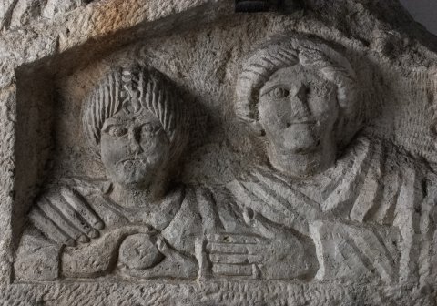 - Familie: unter offenem Giebel Brustbilder von Mutter und Tochter. Links Mädchen: Scheitelschmuck, in den Händen Apfel. Rechts Frau: Mittelscheitel, Ärmeltunica, Fingerring.