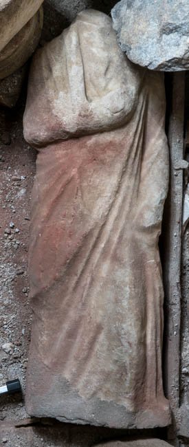 - stark verwittert, Kopf u. Füße fehlen. Rote Bemalung ?