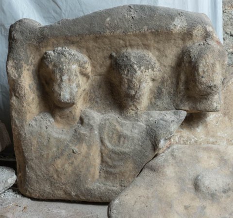 - Bildfeld mit drei Brustbildern (zwei Männer, eine Frau ?). Giebel mit Seitenakroteren. Oberteil einer Stele ?