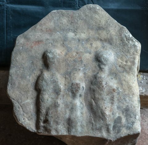 - Stele mit Giebel, im Bildfeld Familie: drei stehende Personen (Kind zwischen Mann und Frau).