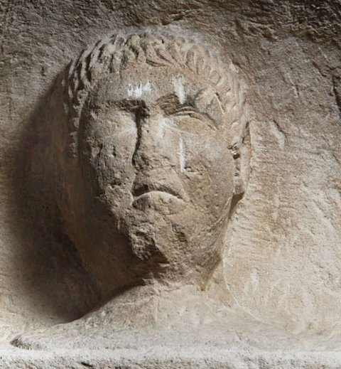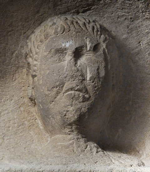 Oberer Abschluss halbrund mit profiliertem Rand. In der Bogennische unbekleidete Halsbüste eines bartlosen Mannes.