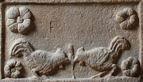 Im Sockelbild Tiere: zwei kämpfende Hähne, vier Rosetten. - Inschrift