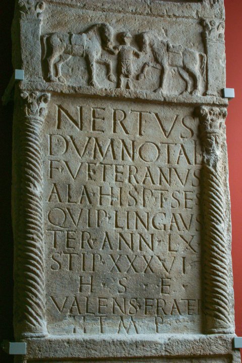 - Nertus / Dumnotali / f(ilius) veteranus / ala(e) Hisp(anorum) I ses/quip(licarius) Lingaus/ter ann(orum) LX / stip(endiorum) XXXVI / h(ic) s(itus) e(st) / Valens frater / h(eres) t(itulum) m(emoriae) p(osuit) / f(ratri ?)