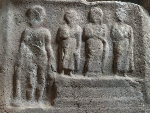- Im Bildfeld links nackter Mann mit Keule (heroisierter Verstorbener als Hercules), neben ihm längliches Podest mit drei stehenden Personen (Frau zwischen zwei Männern).