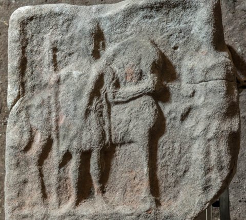 - Mythische Figuren: Donaureiter (Dioskuren). In der Mitte stehende Göttin (?) flankiert von zwei vor ihren Pferden stehenden Jünglingen (nur der linke erhalten) in kurzem Chiton und Mantel, eine Hand am Zügel, in der anderen Lanze.
