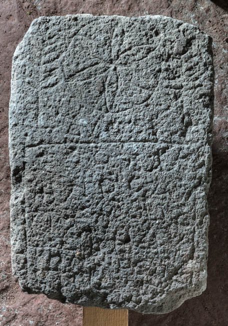 - Oben Kreisrosette zwischen Zweigen, darunter durch Ritzlinien gerahmtes Schriftfeld.