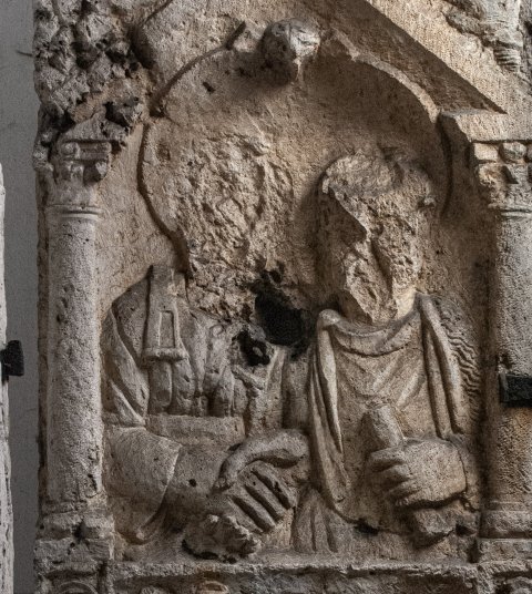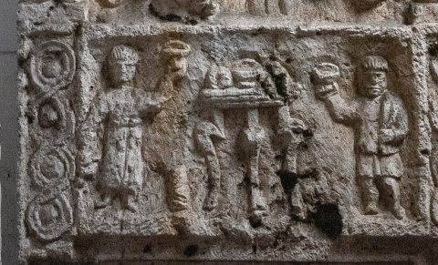 Im Hauptbild zwischen Säulen Muschelnische mit zwei Brustbildern (Ehepaar). Links einheimische Frau: Unter- und Obergewand, Flügelfibeln, Gürtel. Rechts Mann: bärtig, Locken, Ärmeltunica, Sagum mit Fransen, in der Linken Rolle (volumen).