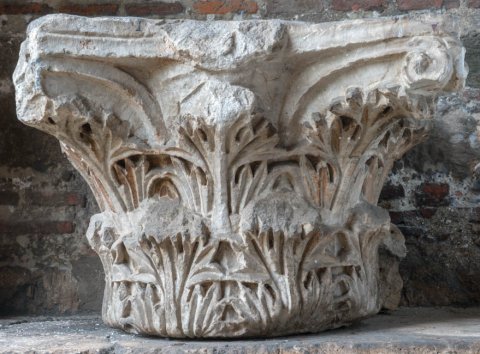 - Korinthisches Kapitell mit zwei Akanthusblattreihen und Abacusblüten.