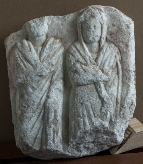 - Zwei stehende Personen, links baertiger Mann in Toga, rechts Frau mit über den Kopf gezogenem Mantel.