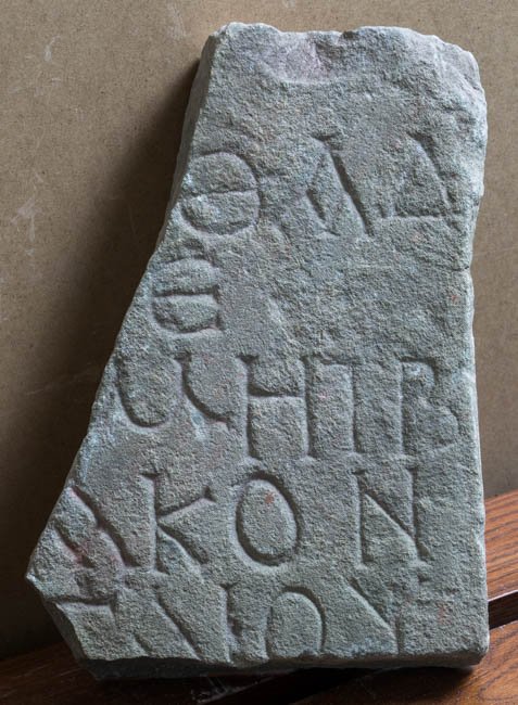 - griechisch: [☩ ἐν]θάδ/[ε κῖτ]ε / [Δη]μήτρ(ιος) / [δι]άκον / [μ]α̣ταίου / [βίου μετα]/[στὰς(?) —]