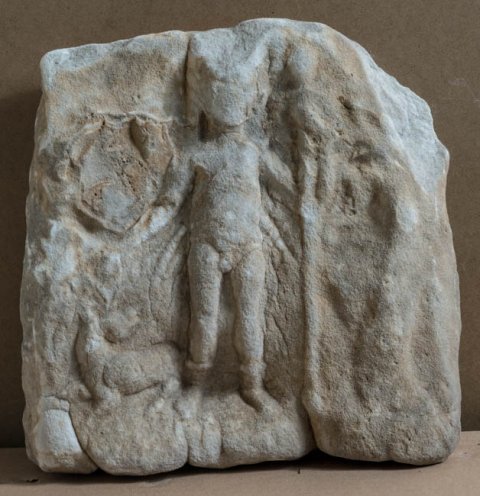 - Mythische Figur: jugendlicher Dionysos (Liber Pater) mit Thyrsosstab und Stiefeln, neben dem rechten Bein liegender Panther.