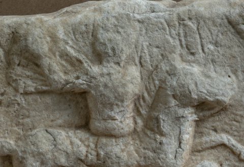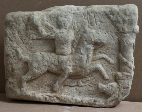 - Mythische Figur: Thrakischer Reiter mit Hund, vor ihm Baum mit Schlange, Eber, Altar.