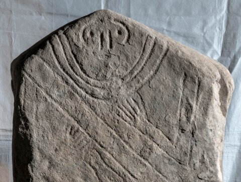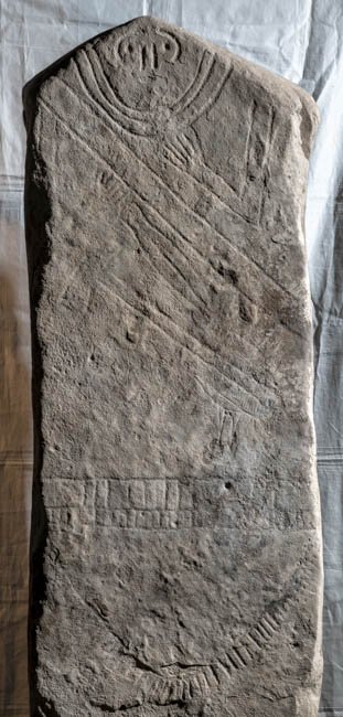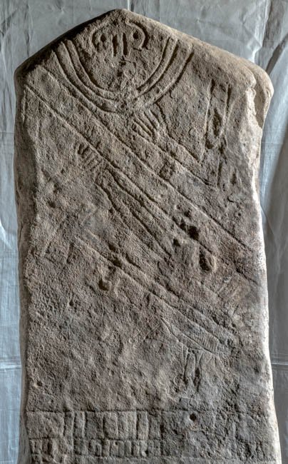 - Stele mit Giebelabschluss, in der Giebelspitze eingeritztes Gesicht, Halsbänder, unterhalb auf die Brust gelegte Arme, diagonal über die Brust geführtes Band, unterhalb davon Werkzeug (Schere, Axt). Gürtel mit Ritzmuster, Schurz mit Fransensaum (?).