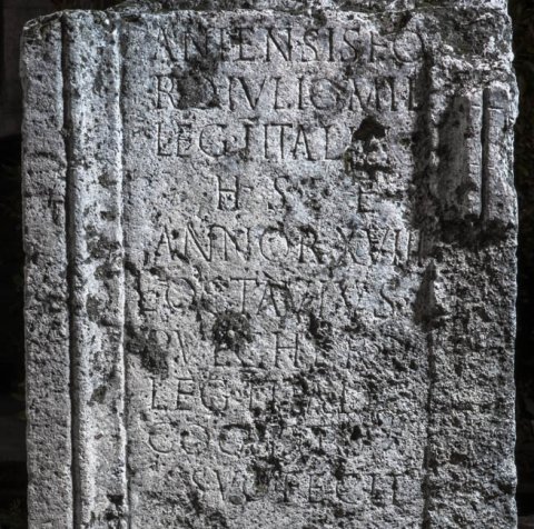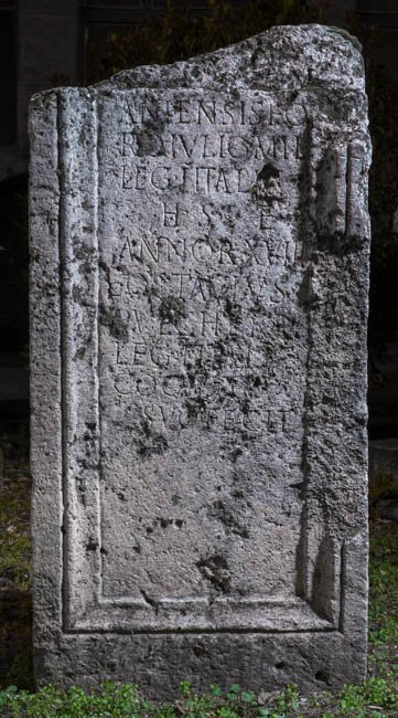- ---] / Aniensis Fo/ro Iulio mil(es) / leg(ionis) I Italic(ae) / h(ic) s(itus) e(st) / annor(um) XVIII / L(ucius) Octavius / Pulcher |(centurio) / leg(ionis) I Italic(ae) / cognato / suo fecit