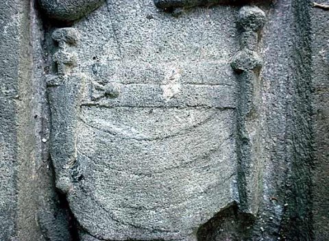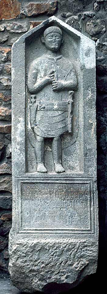 - Unter offenem Giebel Ganzfigur eines Mannes (Soldat): bartlos, glattes Haar (Kappe ?), kurze Tunica, Paenula, Halstuch, doppelter Gürtel, in der Linken Rolle (volumen). Waffen: rechts Dolch, links Schwert (gladius).