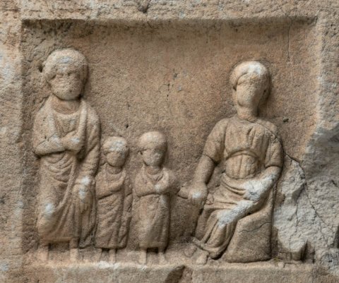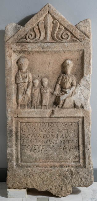 - Stele mit Giebel mit Seitenakroteren, im Giebelfeld Palmette. Im Bildfeld Familie: links stehender Mann im Mantel, neben ihm zwei Kinder (Knaben). Rechts auf Lehnstuhl sitzende Frau, die die Hand des neben ihr stehenden Knaben hält.
