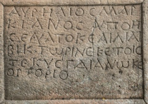 - griechisch: Αὐρήλιος Μαρ/κιανὸς αἰπόη/σεν ἁτο͂ κὲ Αἰλίαι / Βικτωρίνε κὲ τοῖς / τέκυς Γαϊανῷ κὲ / Ὁρτορίο