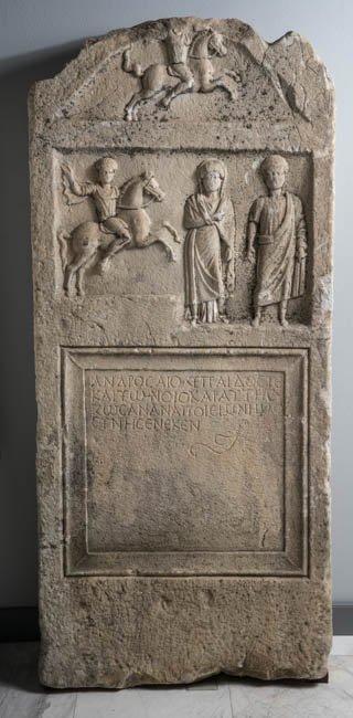- Stele mit Bogenabschluss, im Bogenfeld Reiter im Galopp. Im Bildfeld links Reiter auf niedrigem Podest, rechts stehendes Ehepaar (links Frau mit Schleier, rechts Mann im Mantel).
