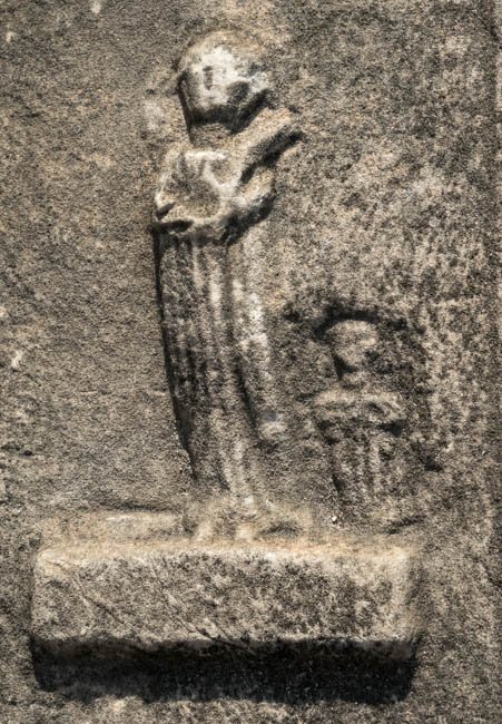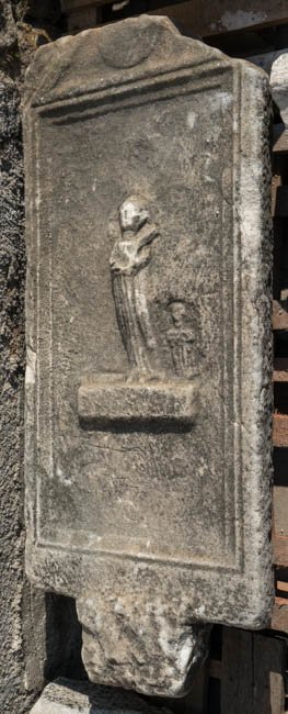 - Stele mit Giebel, im Giebelfeld Scheibe (Rosette ?). Im Bildfeld Standleiste, darauf stehende Frau (Mädchen), die ein größeres Objekt in den Armen hält. An ihrer linken Seite Kleinkind in langem Gewand.