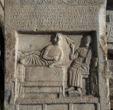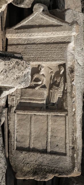 - Giebel mit Akroteren, auf der profilierten unteren Rahmenleiste Zackenfries, unterhalb Spiralranke (beides geritzt). Bildfeld mit Totenmahl: Mann auf Kline, rechts Frau mit Fächer in einem Lehnsessel mit Schemel, neben ihr Dienerin mit Gefäß auf dem Kopf. Am Fußende der Kline Diener und Tisch mit Gefäß. Unterhalb des Bildfeldes durch vertikale Leisten dreigeteiltes Feld.