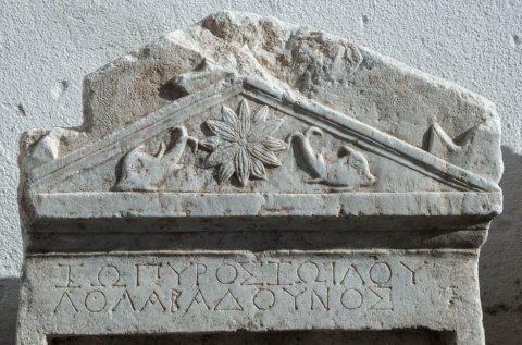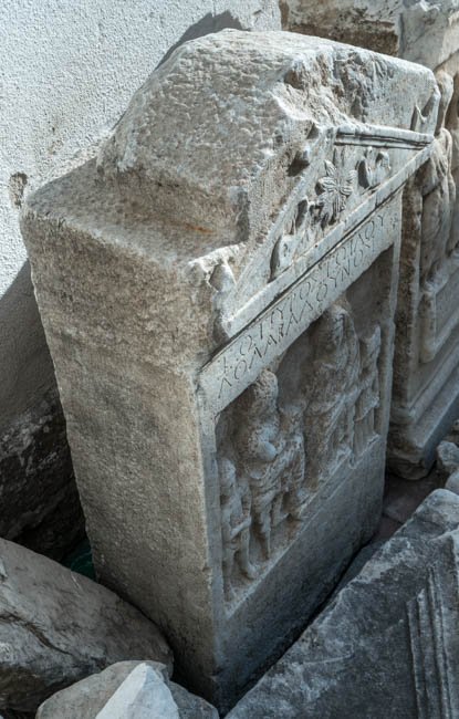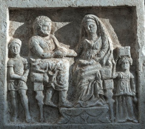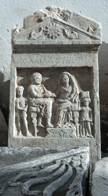 - Giebel mit Akrotere, im Giebelfeld Sternrosette zwischen Delphinen. Im Bildfeld Totenmahl: auf einer Kline sitzendes Ehepaar (bärtiger Mann, Frau mit Schleier), links stehender Knabe, rechts Mädchen (Dienerin) mit Kästchen auf dem Kopf.