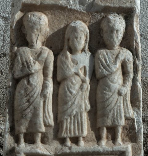 - Auf dem Rahmen der Schrifttafel drei stehende Personen einer Familie: Frau mit Schleier zwischen zwei Männern im Mantel.