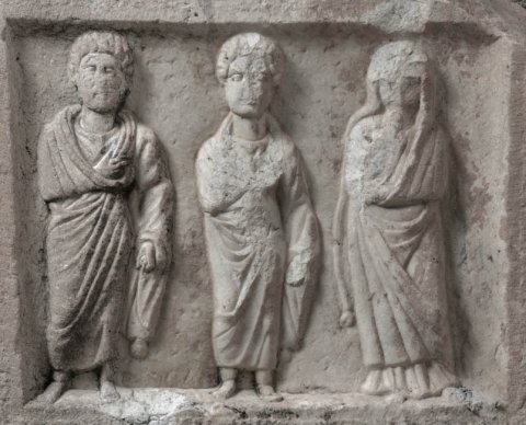 - Giebel abgebrochen, im Bildfeld drei stehende Personen: bärtiger Mann im Mantel, Jüngling im Mantel, Frau mit über den Kopf gezogenem Mantel.