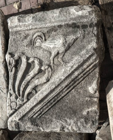 - Eingeschriebener Giebel, im Giebelfeld Reliefrest (Tier ?). Palmettenakroter, über der Giebelschräge Hahn.