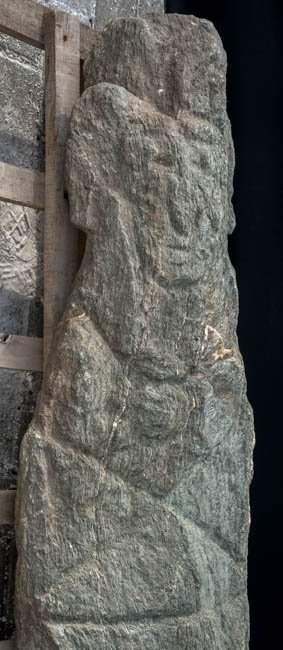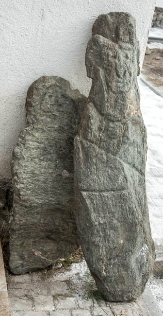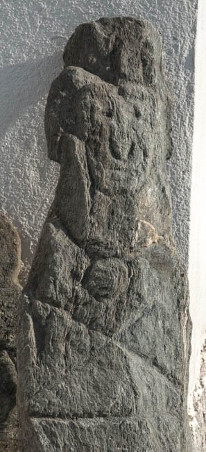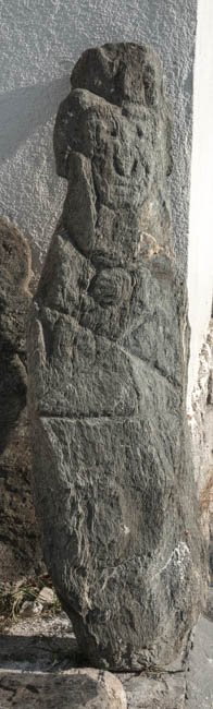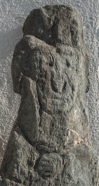 - grob zugehauene Stele mit menschlichem Kopf, Hand auf der Brust