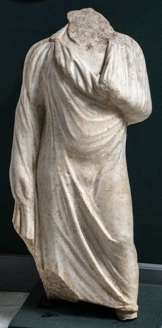 - Stehender Knabe, ganz in einen Mantel gehüllt, auf der rechten Schulter Scheibenfibel.