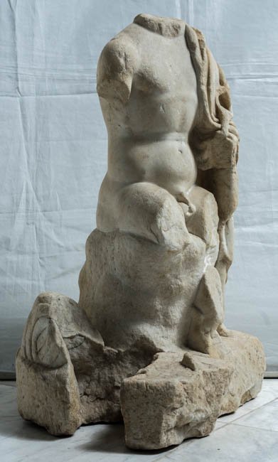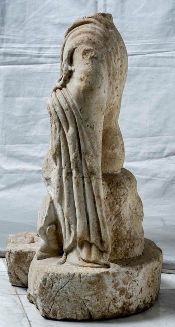 - Kopf, rechter Arm, linke Hand, Teile der Beine abgebr., Sockel zerbr.