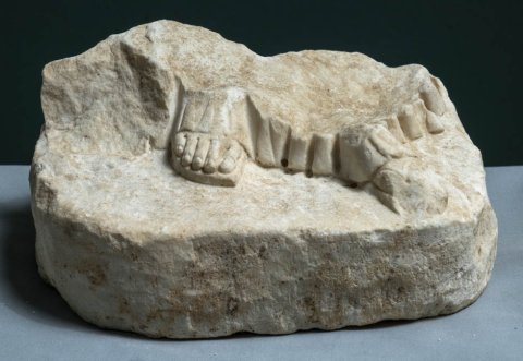 - Plinthe mit Füßen in Sandalen und Gewandsaum. Gottheit ?