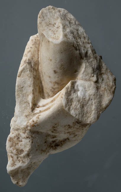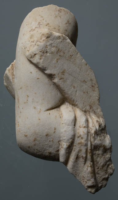 - Rechter abgewinkelter Arm, über dem Unterarm Draperie, in der Armbeuge Attribut (Ruder ?).