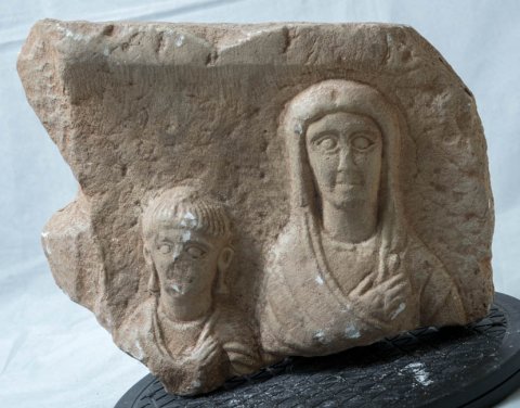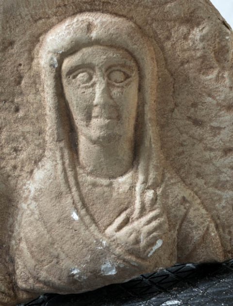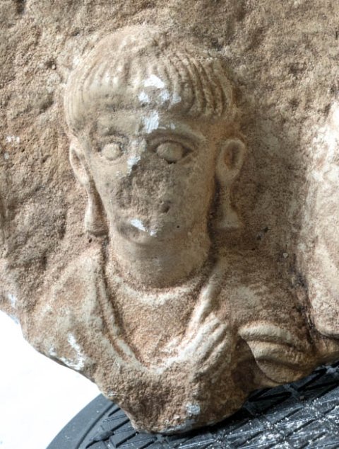- Familie: Rest von drei stehenden Personen. Rechts Frau mit über den Kopf gezogenem Mantel, in der Mitte Kind (Mädchen) mit Ohrgehängen, links Spuren eines weiteren Erwachsenen.