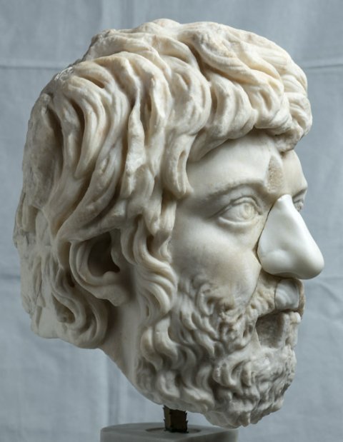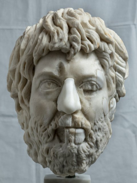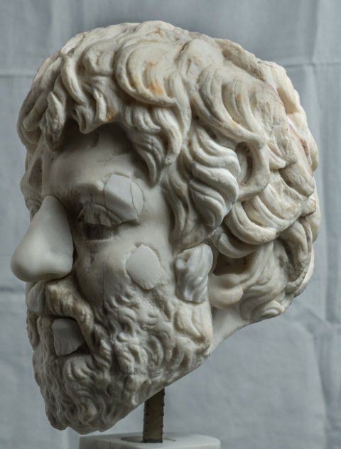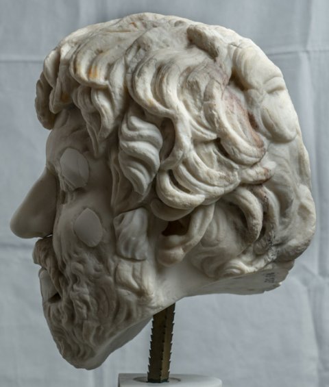 - bestoßen, Nase ergänzt, Flickstellen an Mund, linker Wange u. linker Schläfe. Bruch unterhalb des Kinns