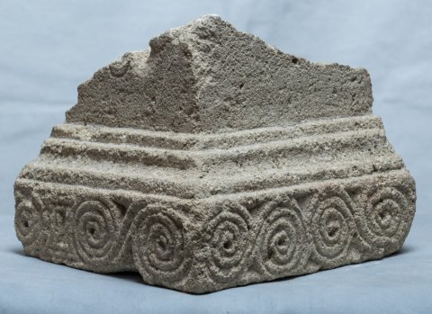 - Aufsatz mit Eckakroteren und Kerbschnittdekor, auf den Rändern von Deckplatte und Sockel Spiralband.