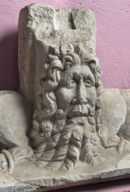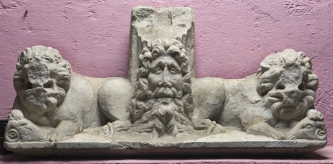 - Bärtiger Männerkopf mit langen Locken zwischen liegenden Löwen mit Widderköpfen in den Pranken.