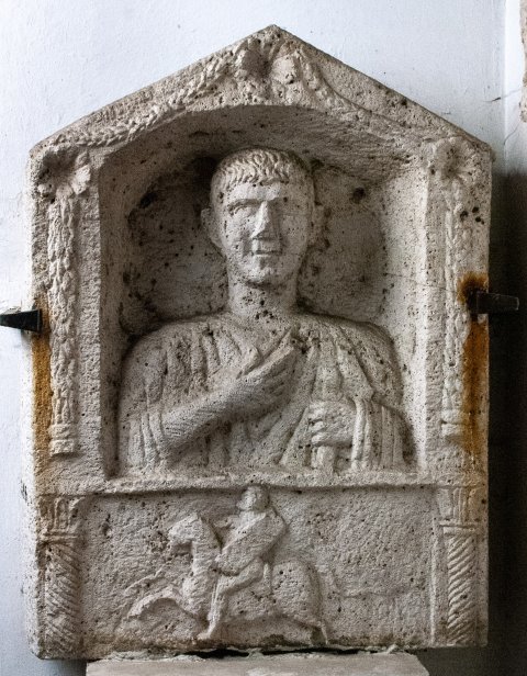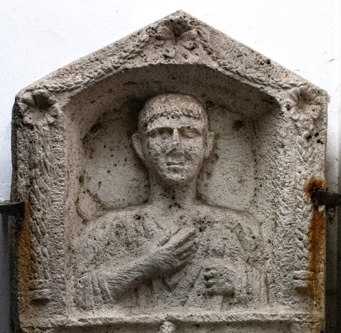 Im Hauptbild Brustbild eines Mannes: bartlos, gesträhntes Haar, Ärmeltunica, Mantel, Rolle (volumen).