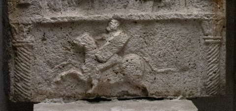 Im Zwischenbild zwischen Säulen mit Spiralkanneluren Reiter (Soldat) mit Schild nach links.