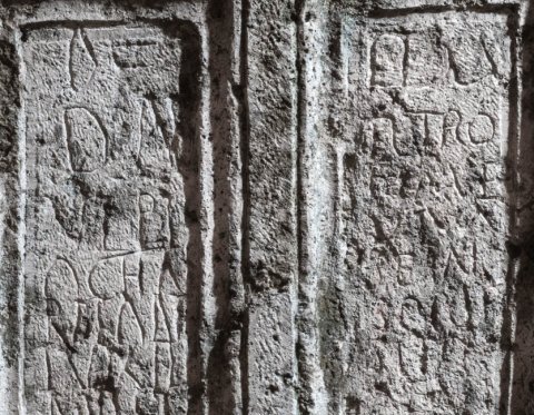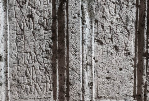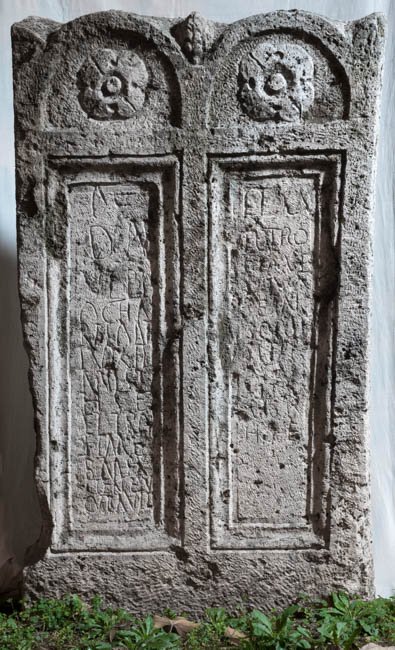 - Zwei gerahmte Schriftfelder, darüber je eine Bogennische mit Rosette, seitliche Akrotere, zwischen den Bögen Pinienzapfen.