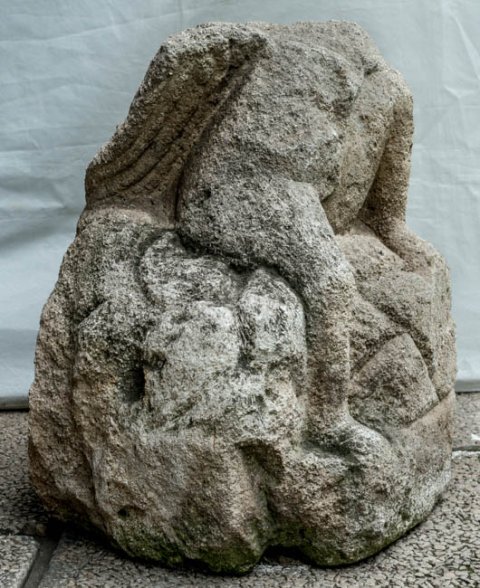 - Auf einem Felsen sitzender Trauergenius (nackter geflügelter Knabe mit hochgezogenem linken Bein).