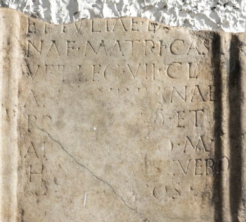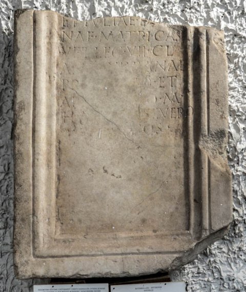 - [Impp(eratoribus) Caess(aribus)] / [L(ucio) Sept(imio) Severo] / [et M(arco) Aur(elio) Anto]/[nino Augg(ustis) et [[P(ublio)]]] / [[[Sept(imio) Getae Caes(ari)]]] / et Iuliae Do[m]/nae matri cast(rorum) / vet(erani) leg(ionis) VII Cl(audiae) / Antoninianae / pro[b(ati) Poll]io(ne) et / Ap[ro II co(n)s(ulibus)] m(issi) / h[on(esta) miss(ione) Imp(eratore)?] Severo / [et Anton(ino)] co(n)s(ulibus)