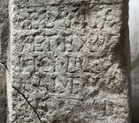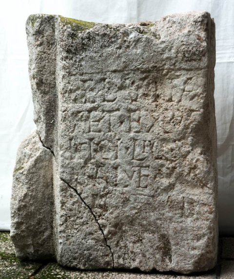 - für sekundäre Verwendung beschnitten u. seitlich abgearbeitet und profiliert, in der Oberseite Aushöhlung, Inschrift stark bestoßen