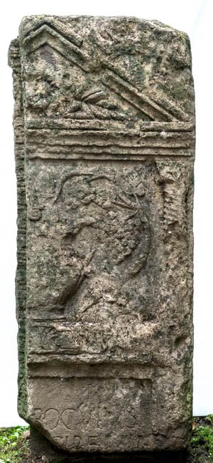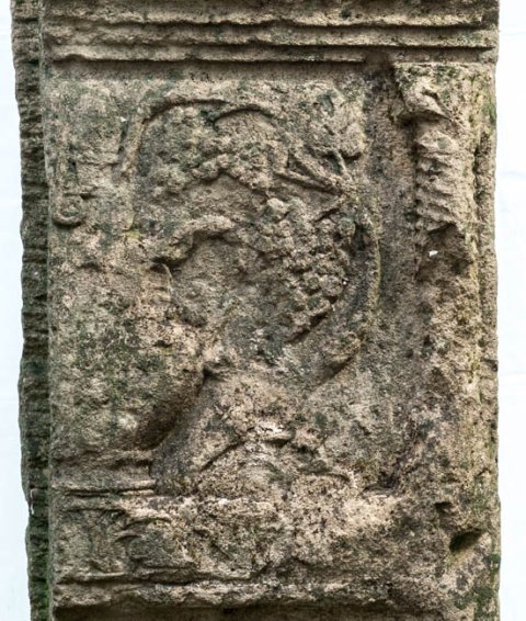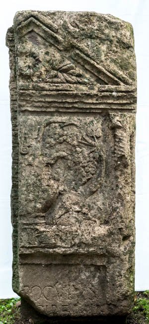 - Eingeschriebener Giebel mit Rosette zwischen Blättern, auf den Giebelschrägen Delphine (?). Bildfeld zwischen Säulen mit Spiralkanneluren, darüber Architrav mit Fascien. Krater mit Weinranken. Gerahmtes Schriftfeld.