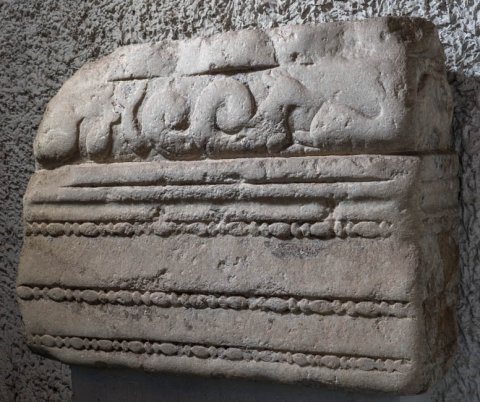 - Rechter Eckblock eines Architravs. Fascien mit Astragalstäben, oben Meerwesenfries.
