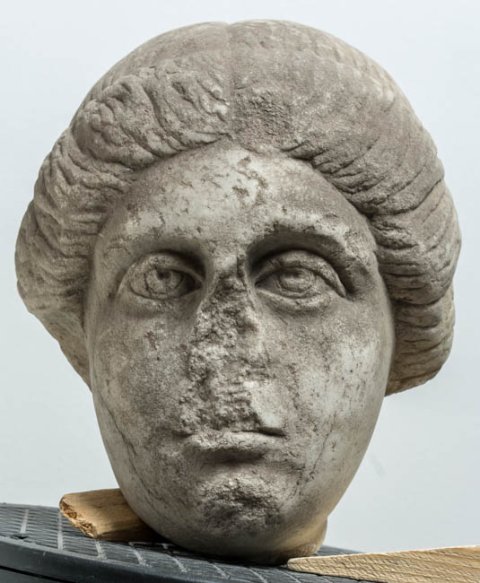 - bestoßen, Bruch unterhalb des Kinns, Nase u. Hinterkopf abgebr.